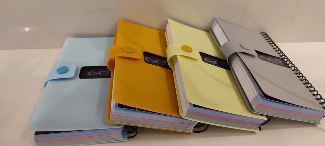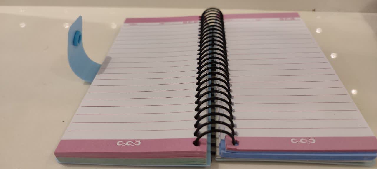 ۱۵۰ برگ در سه بخش آبی، صورتی، سبز که هر بخش ۵۰ برگ دارد ابعاد دفترچه ۱۶×۱۱ دکمه دار کاغذ 70 گرم